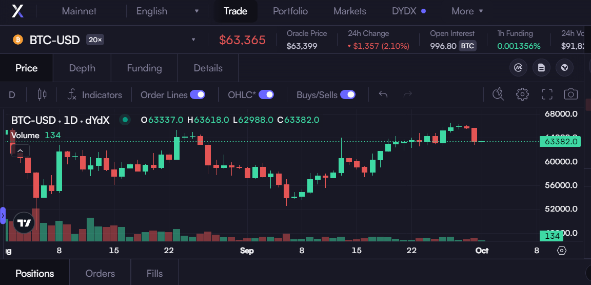 En dYdX, los traders pueden abrir contratos perpetuos con criptomonedas como Bitcoin o Ethereum, y usar hasta 20 veces el apalancamiento, lo que les permite aumentar sus posiciones y potenciales ganancias.