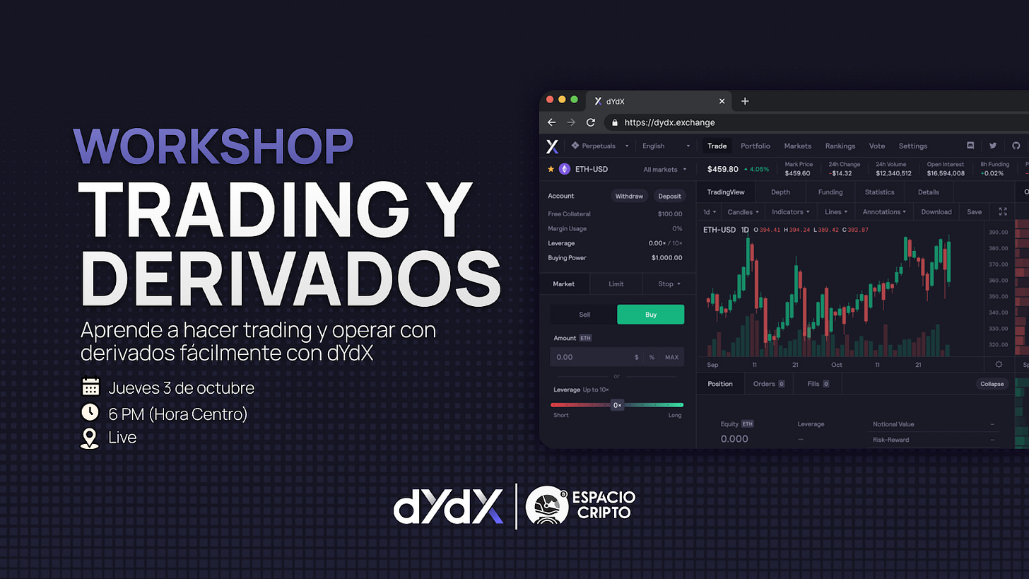 Este jueves 3 de octubre a las 6 PM hora México Centro, tenemos un workshop gratuito en vivo, donde te enseñaremos cómo aprovechar dYdX para hacer trading de derivados de manera fácil y lucrativa.